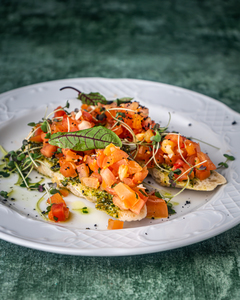 2 grzanki, pomidory, czosnek, bazylia, ocet balsamiczny redukowany