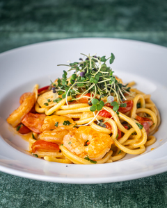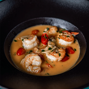 krewetki black tiger (5 szt), sos winno maślany, czosnek, papryczka chilli, pomidorki koktajlowe, pietruszka i pieczywo