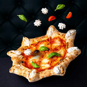 Margherita (pomidory pelami, grana padano, mozzarella fior di latte, bazylia) w kształcie gwiazdy z brzegami wypełnionymi serem ricotta
