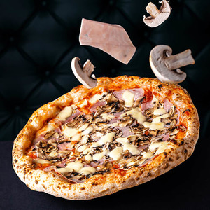 pomidory pelati, mozzarella fior di latte, grana padano, prosciutto cotto, pieczarki