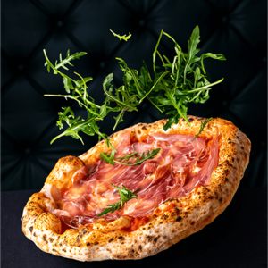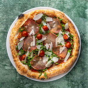 pomidory pelati, mozzarella fior di latte, grana padano, prosciutto Parma, rukola