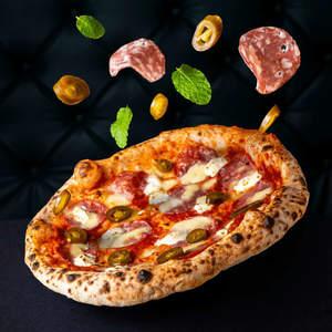 pomidory pelati, mozzarella fior di latte, grana padano, salami, mascarpone, jalapeno, mięta