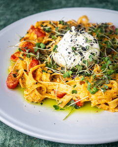 pesto Trapanese, pomidory cherry, pecorino romano, migdały, bazylia, oliwa extra virgin, puder z czarnej oliwki