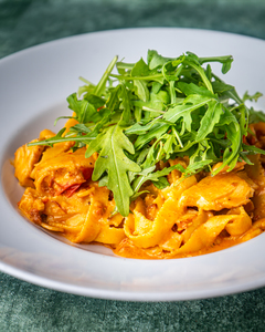 'nduja, gorgonzola, białe wino, czosnek, pomidory cherry, mascarpone, grana padano, rukola