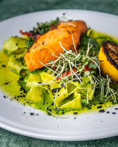 bastowany stek z łososia, szalotka, czosnek, emulsja ze szpinaku, suszone pomidory, świeży baby szpinak