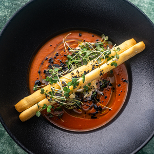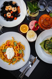 pesto Trapanese, pomidory cherry, pecorino romano, migdały, bazylia, oliwa extra virgin, puder z czarnej oliwki