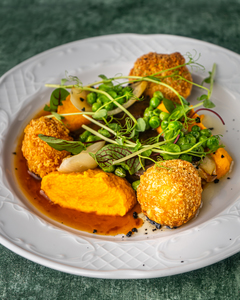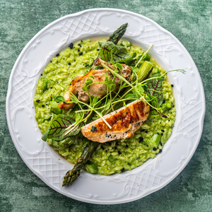 bastowany stek z łososia, szalotka, czosnek, emulsja ze szpinaku, suszone pomidory, świeży baby szpinak