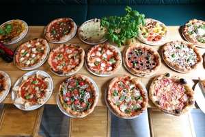 pomidory pelati, mozzarella fior di latte, grana padano, 'nuda, ronzino, rukola, pomidorki koktajlowe, pecorino romano w płatkach