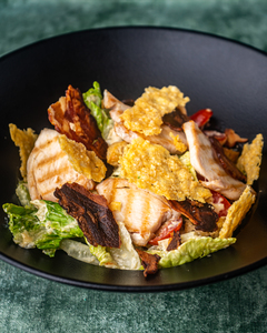 sałata rzymska, kurczak, sos cezar, chips z boczku, pomidorki, chips z grana padano